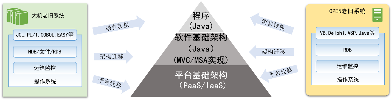 该解决方案包含从资产整理,既有系统分析,系统转换,系统测试,数据库迁移等各个工程的方法论,工具,以及系统迁移标准工程定义。可在忠实的执行将既有系统的业务继承的基础上,确保高自动化率。同时,可将老朽系统迁移到PaaS平台上,老朽系统的程序语言现代化之外,实现的系统架构的现代化,系统运维的现代化,以及数据的现代化。可以为用户挖掘既有系统的资产的价值,实现系统数据化转型到来的附加价值。